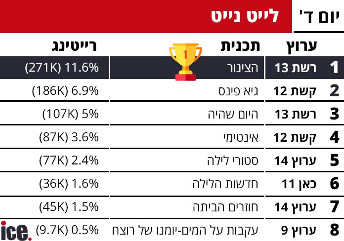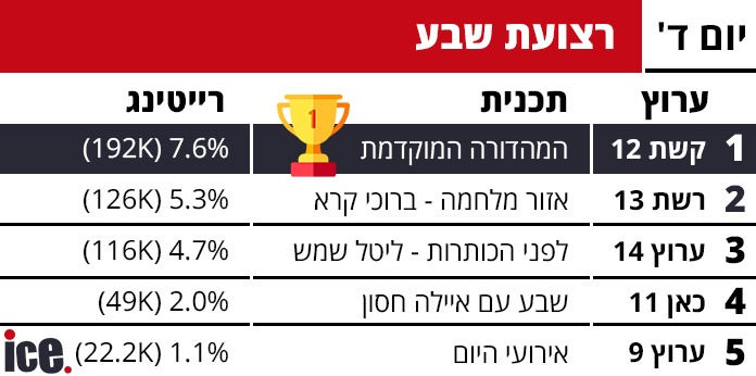 רייטינג: רשת 13 דורסת את קשת 12 בפעם הרביעית ברצף