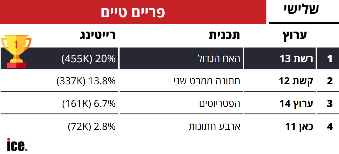ברצועת הפריים טיים היוקרתית, "האח הגדול" של רשת 13 מוביל ברור עם רייטינג של 20.0% ו-455 אלף צופים - הציון הגבוה ביותר בכל הנתונים. קשת 12 מגיבה עם "חתונה ממבט שני" שמשיגה 13.8% רייטינג ו-337 אלף צופים. ערוץ 14 בא במקום השלישי עם "הפטריוטים עם איתמר פליישמן" ברייטינג של 6.7% עם 161 אלף צופים. כאן 11 סוגרת את הרצועה עם "ארבע חתונות" ברייטינג של 2.8% ו-72 אלף צופים.