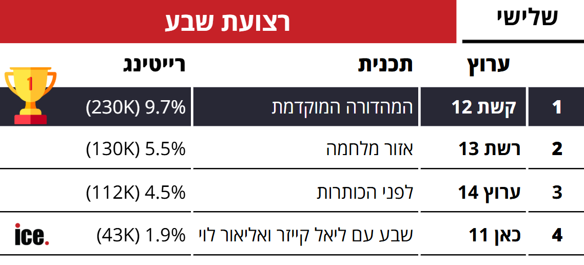 ברצועת 19:00 הקריטית, "המהדורה המוקדמת עם גדעון אוקו" בקשת 12 מובילה בבירור עם 9.7% רייטינג ו-230 אלף צופים. רשת 13 ממשיכה עם "אזור מלחמה" של ברוך קרא שמשיגה 5.5% רייטינג עם 130 אלף צופים - ציון זהה ל"לפני הכותרות" בערוץ 14, שמצליח לגייס 112 אלף צופים. כאן 11 סוגרת את הרצועה עם "שבע" ברייטינג נמוך של 1.9% עם 43 אלף צופים בלבד.