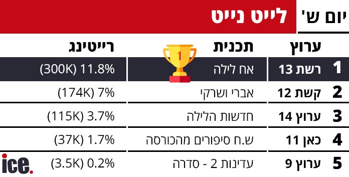 כאמור גם בגזרת הלייט נייט רושמת רשת 13 ניצחון מרשים עם נתון של 11.8% ו-300 אלף צופים שהעדיפו לצפות בקווין רובין ופרשני אח לילה מנתחים את ההדחה של דרור על פני אברי ושרקי בקשת 12 שזכו לאחוז של 7% ו-174 אלף צופים. חדשות הלילה של ערוץ 14 גם כן עם נתון נמוך של 3.7% ו-115 אלף צופים.