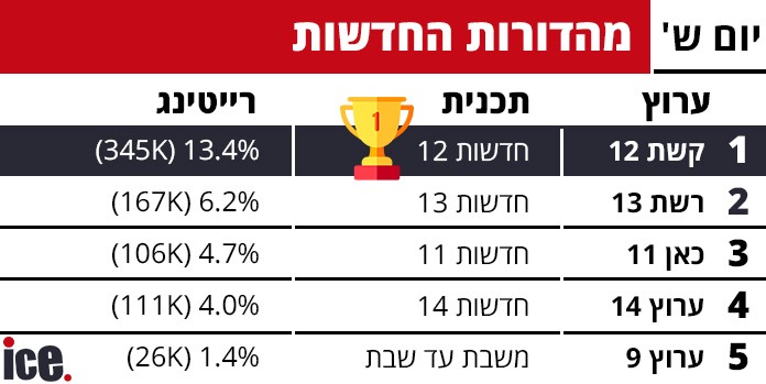 אולם, בניגוד לגזרת הפריים טיים, בשעות של החדשות רושמת קשת 12 ניצחונות גדולים. 13.4% ו-345 אלף צופים ראו את חדשות השבת של קשת 12 לעומת 6.2% ו-167 אלף צופים שהעדיפו לצפות בחדשות 13. כאן 11 עקפה את ערוץ 14 עם 4.7% רייטינג ו-106 אלף צופים לעומת 4% רייטינג ו-111 אלף צופים.