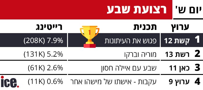 2.ומה לגבי נתוני הרייטינג של יום שישי? (ל"ת)אזרח הגון 08/2025/17הגב לתגובה זו2 0סגור