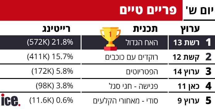 כמו בכל העונה האחרונה, גם אמש ניצחה רשת 13 בגדול בקרב הפריים טיים את קשת 12, כאשר 21.8% ו-572 אלף אנשים העדיפו את ההדחה הדרמטית של דרור על פני רוקדים עם כוכבים, הפטריוטים בערוץ 14 ממשיכה להיחלש עם נתון נמוך במיוחד