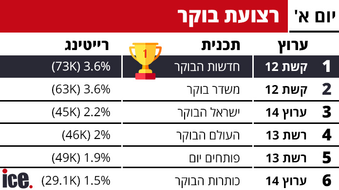 ברצועת הבוקר המתחרה, קשת 12 מחזיקה במקומות הבכירים עם שני תכניות מובילות: "חדשות הבוקר" עם נסלי ברדה רושמת 3.6% רייטינג ו-73 אלף צופים, ו"משדר בוקר" של יואב לימור זוכה לאותו רייטינג של 3.6% עם 63 אלף צופים. ערוץ 14 מגיע למקום השלישי עם "ישראל הבוקר" של עידן טאובר ברייטינג של 2.2% ו-45 אלף צופים. רשת 13 מחולקת בין "העולם הבוקר" עם 2% רייטינג ו-46 אלף צופים ו"פותחים יום" ברייטינג של 1.9% ו-49 אלף צופים. ערוץ 14 סוגר עם "על הבוקר" ברייטינג של 1.5% ו-37 אלף צופים.