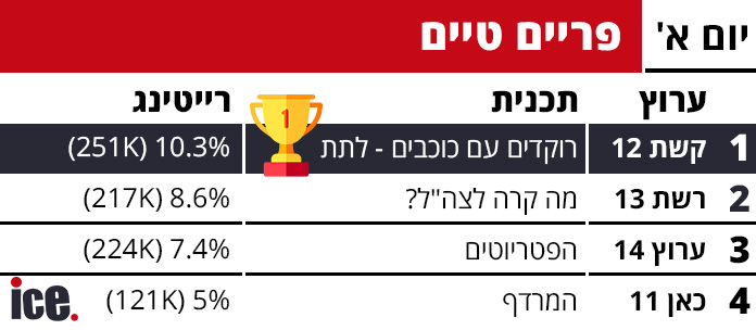 קשת 12 ממשיכה לשלוט עם "רוקדים עם כוכבים לתת באהבה" שמושכת 10.3% רייטינג ו-251 אלף צופים מסורים. רשת 13 מגיעה למקום השני עם הדוקומנטרי "מה קרה לצה״ל?" ועוקפת את הפטריוטים