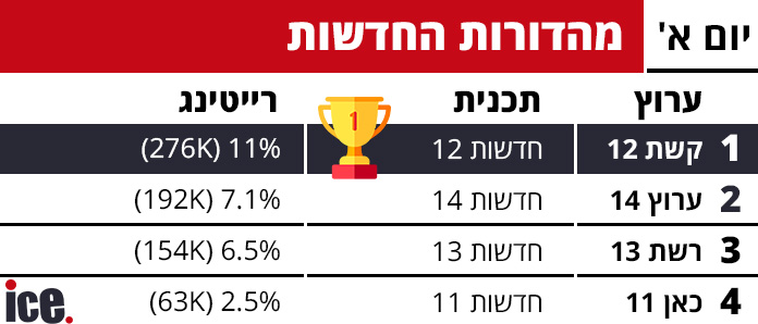 נתוני הרייטינג מאמש (ראשון) חושפים תמונה ברורה של מאבק הערוצים על תשומת הלב הישראלית, כאשר קשת 12 מבססת את עליונותה ברוב רצועות השידור המרכזיות. הנתונים מעידים על התחרות הקשה בין הערוצים המסחריים, תוך שכאן 11 מתקשה להתקרב לביצועי ערוץ 14 ורשת 13