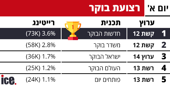 ברצועת הבוקר חדשות הבוקר של קשת 12 הניבו 3.6% ו-74 אלף צופים, משדר הבוקר עם יואב לימור ונסלי ברדה המשיך עם 2.8%. אחריהן ישראל הבוקר בערוץ 14 עם 1.7% ועל הבוקר עם 1.4%. ברשת 13 נותרו מאוכזבים אחרונים עם 1.2% להעולם הבוקר ורק 1.1% לפותחים יום.