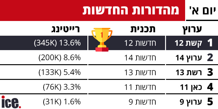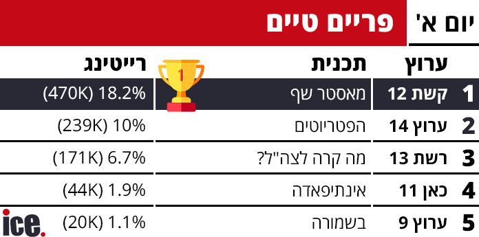 קשת 12 שולטת בנתוני הצפייה מאמש (ראשון) כאשר מאסטר שף משיג נתון נהדר 18.2% והמהדורה המרכזית מובילה בפער ענק. האח הגדול כבר לא כאן ולרשת 13 אין פתרונות בדיוק כמו ערוץ 14.