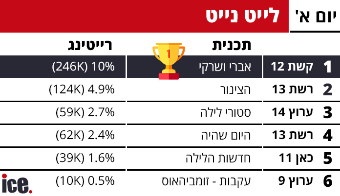 ברצועת הלייט, תכנית "אברי ושרקי" של קשת 12 המשיכה במסורת עם 10% ו-246 אלף צופים. רשת 13 הציגה פער גדול בין שתי התכניות שלה: "הצינור" השיגה 4.9% עם 124 אלף צופים, בעוד "היום שהיה" הסתפקה ב-2.4% ו-62 אלף צופים. ערוץ 14 רשם 2.7% ו-59 אלף צופים עם "סטורי לילה", וכאן 11 סגרה עם "חדשות הלילה" ב-1.6% ו-39 אלף צופים.
