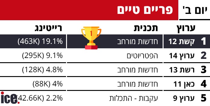 בשעות הפריים טיים, קשת 12 המשיכה את מסע הניצחונות שלה. המהדורה המורחבת בשעה 21:00 הגיעה ל-19.1% עם 463 אלף צופים - תוצאה מדהימה שמדגימה את האמון הרב שהצופים נותנים בה. הפטריוטים היו קרובים לשחזר את הנתון מיום ראשון