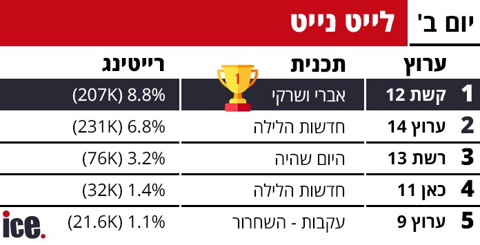בשעות הלילה המאוחרות, "אברי ושרקי" בקשת 12 הובילו עם 8.8% ו-207 אלף צופים. ערוץ 14 הציג ביצועים חזקים עם חדשות הלילה שלו שתפסו 6.8% ו-231 אלף צופים - תוצאה טובה במיוחד לשעה מאוחרת. "היום שהיה" ברשת 13 הגיע ל-3.2% עם 76 אלף צופים, בעוד חדשות הלילה בכאן 11 סגרו את הרשימה עם 1.4% ו-32 אלף צופים בלבד.