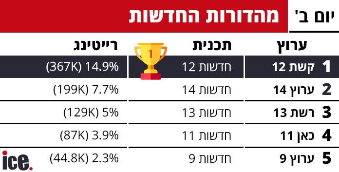 במרוץ המהדורות המרכזיות, חדשות 12 המשיכו לשלוט ללא עוררין עם 15% נתח צפייה ו-367 אלף צופים. למקום השני הגיע ערוץ 14 עם 7.7% ו-200 אלף צופים, הישג משמעותי שממשיך להציב אותו כמתחרה רציני. חדשות 13 תפסו את המדרג השלישי עם 5% ו-129 אלף צופים, בעוד חדשות 11 סגרו את הרשימה עם 3.8% ו-86 אלף צופים בלבד.