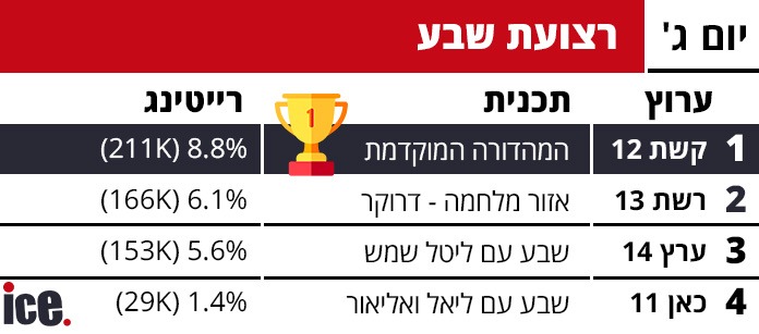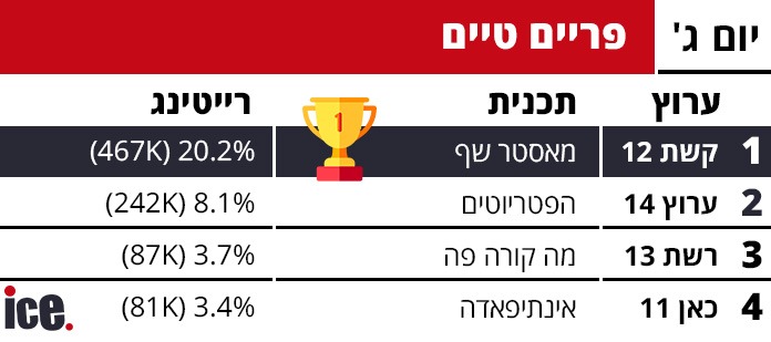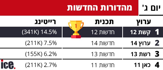 יום השידורים אמש (שלישי) הציג דומיננטיות מוחלטת של קשת 12 כמעט בכל רצועות השידור, כאשר "מאסטר שף" המשיך להוכיח את עצמו כמלך הפריים טיים הבלתי מעורער. ערוץ 14 המשיך להציג ביצועים יציבים ומכובדים, בעוד רשת 13 וכאן 11 נאבקו בתחתית הטבלה עם תוצאות מאכזבות.