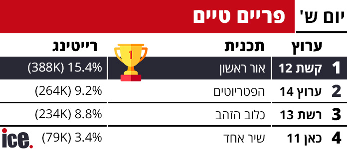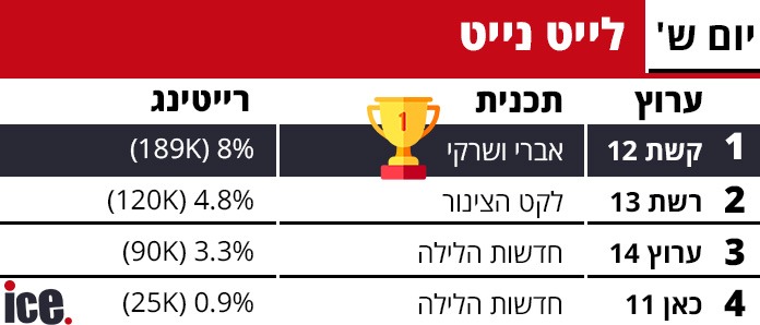 קשת 12 שולטת ברצועות השידור, ערוץ 14 מפתיע בפריים טיים וגובר על 'כלוב הזהב' ברשת 13 שדווקא היה די קרוב למקום השני. איילה חסון משיגה שני ניצחונות יקרים לכאן 11 מול ערוץ 14.