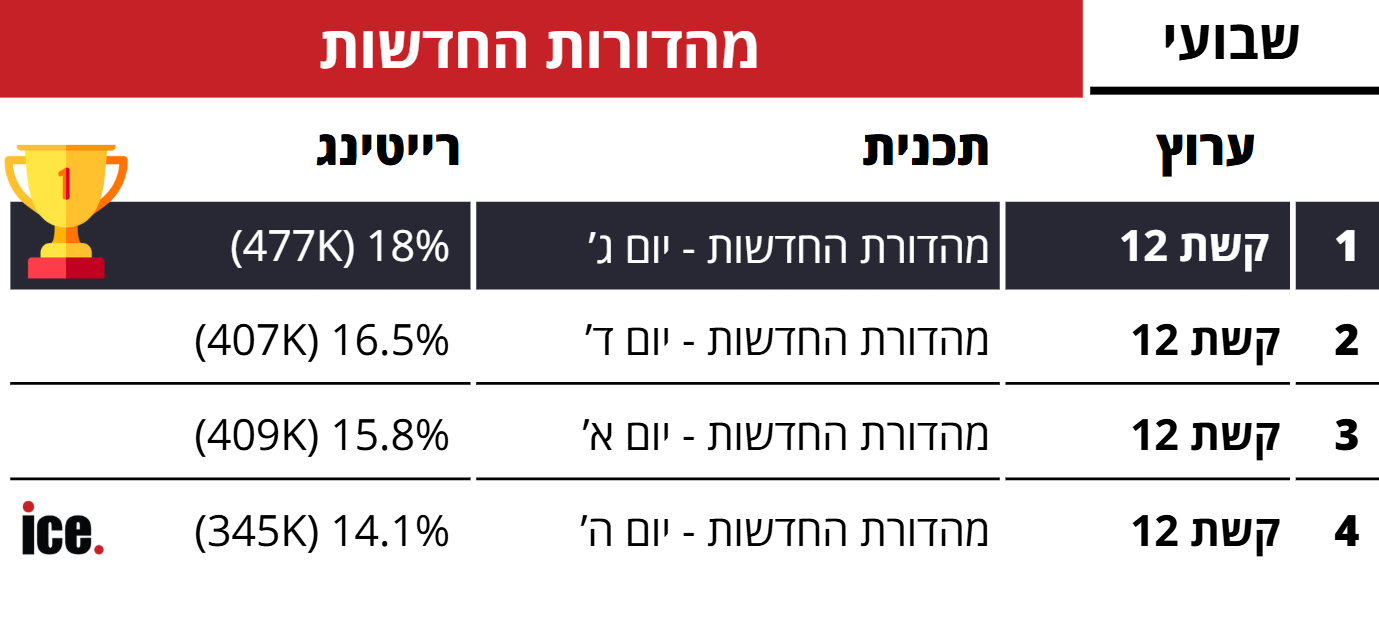 רייטינג שבועי: קשת 12 עושים משהו נכון, ולא משאירים מקום לערוץ 14