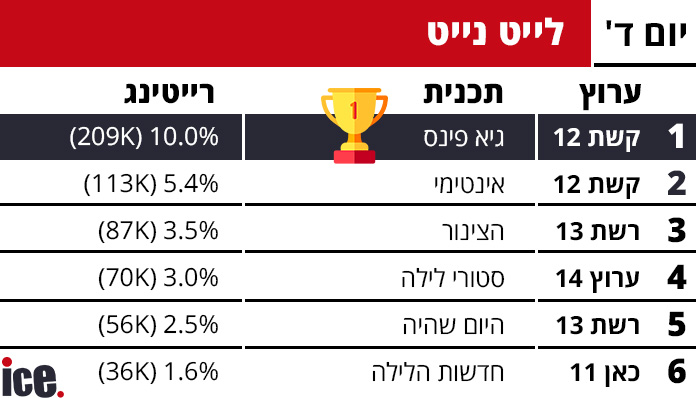 ברצועת הלייט נייט המאוחרת, "גיא פינס" בקשת 12 המשיך להוביל בבירור עם 10.0% שיעור צפייה ו-209 אלף צופים. במקום השני "פתחי את שי" בערוץ 14 עם 6.3% ו-162 אלף צופים. "הזירה" בכאן 11 רשמה 4.0% עם 102 אלף צופים, ואילו "הצינור" ברשת 13 סגרה את הרצועה עם 3.5% ו-87 אלף צופים.