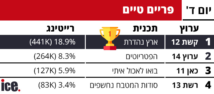 ארץ נהדרת מובילה את הפריים טיים וחדשות 12 ממשיכה לשלוט במהדורות. קשת 12 שומרת על הדומיננטיות שלה ברוב רצועות השידור, בעוד ערוץ 14 מתחזק במקום השני והרשתות המתחרות מתקשות לצמצם את הפערים