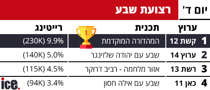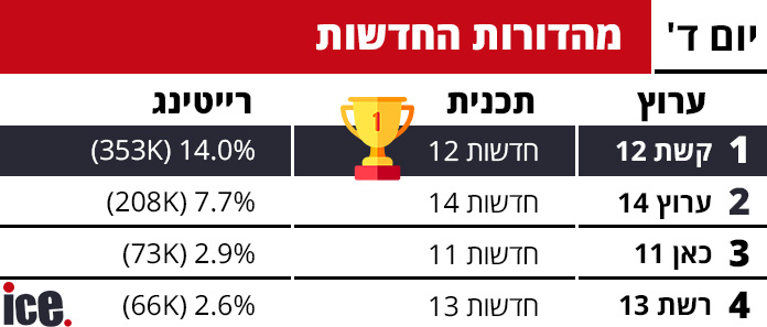 נתוני הרייטינג מאתמול (רביעי) משקפים פעם נוספת את המשך הדומיננטיות של קשת 12 בכל רצועות השידור המרכזיות, כאשר התכניות שלה מצליחות למשוך את הקהל הרחב הן בחדשות, בפריים טיים ובשעות המאוחרות. ערוץ 14 ממשיך להחזיק במקום השני היציב, בעוד רשת 13 וכאן 11 מתקשות לצמצם את הפערים.