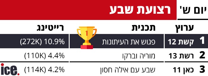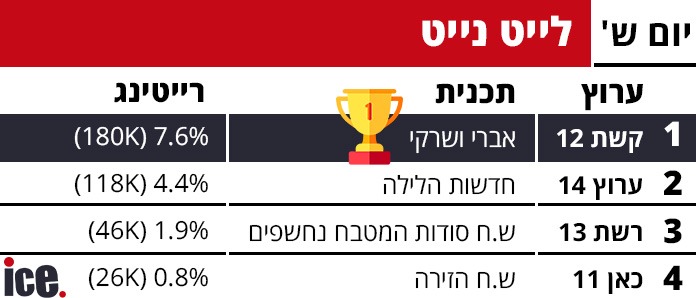 נתוני הרייטינג מאתמול (שבת) משקפים המשך השליטה של קשת 12 בכל רצועות השידור המרכזיות, כאשר התכניות שלה מצליחות למשוך את הקהל הן בחדשות, בפריים טיים ובשעות הלייט. ערוץ 14 ממשיך להחזיק במקום השני היציב, בעוד רשת 13 וכאן 11 מתקשות לצמצם את הפערים הגדולים.