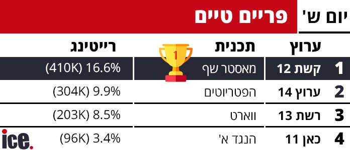 בשעות הפריים טיים המבוקשות המשיך "מאסטר שף" של קשת 12 להוביל את הרייטינג עם 16.6% שיעור צפייה ו-410 אלף צופים. במקום השני "הפטריוטים" בערוץ 14 עם 9.9% ו-304 אלף צופים. "ווארט" ברשת 13 רשמה 8.5% עם 203 אלף צופים. "הנגד א'" בכאן 11 הגיעה ל-3.4% עם 96 אלף צופים, בעוד "פרויקט משפחות" באותו הערוץ סגרה את רצועת הפריים טיים עם 1.2% ו-35 אלף צופים בלבד.