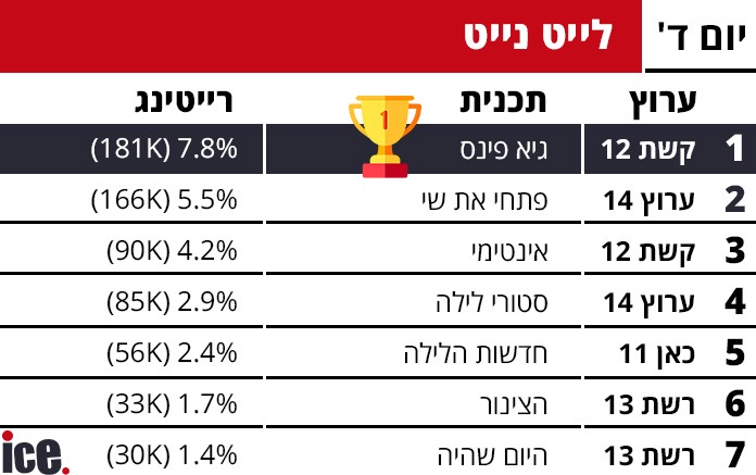 בשעות הלילה המאוחרות, "גיא פינס" בקשת 12 הובילה עם 7.8% ו-181 אלף צופים. "אינטימי" באותו ערוץ המשיכה עם 4.2% ו-90 אלף צופים. "סטורי לילה" בערוץ 14 רשמה 2.9% ו-85 אלף צופים, ואחריה "חדשות הלילה" בכאן 11 עם 2.4% ו-56 אלף צופים. "הצינור" ברשת 13 הגיעה ל-1.7% ו-33 אלף צופים, ו"היום שהיה" ברשת 13 סגרה את הערב עם 1.4% ו-30 אלף צופים.
