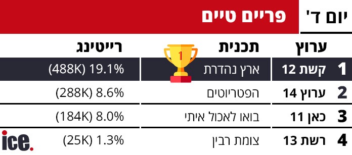 תוכנית "ארץ נהדרת" בקשת 12 השיגה את הרייטינג הגבוה ביותר של הערב כולו עם 19.1% ו-489 אלף צופים - ניצחון סוחף. "הפטריוטים" בהגשת ינון מגל בערוץ 14 הגיעה למקום השני אבל ירדה במספרים. רשת 13 לא באותה ליגה בכלל