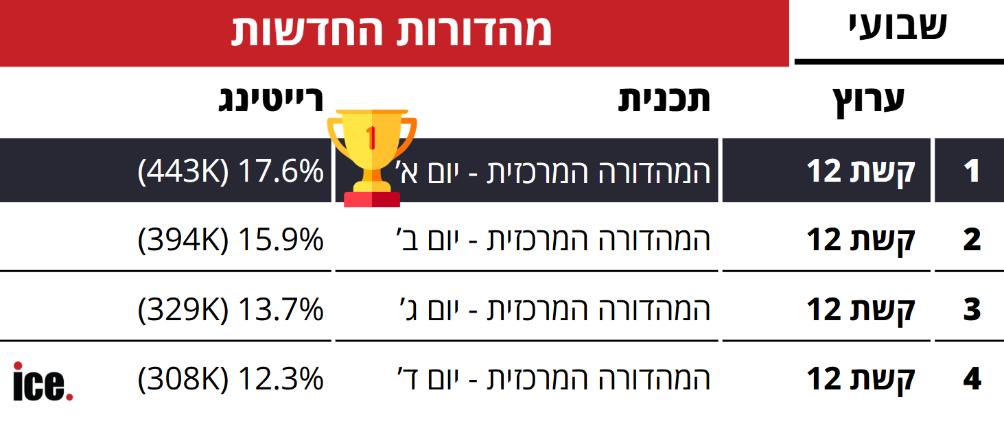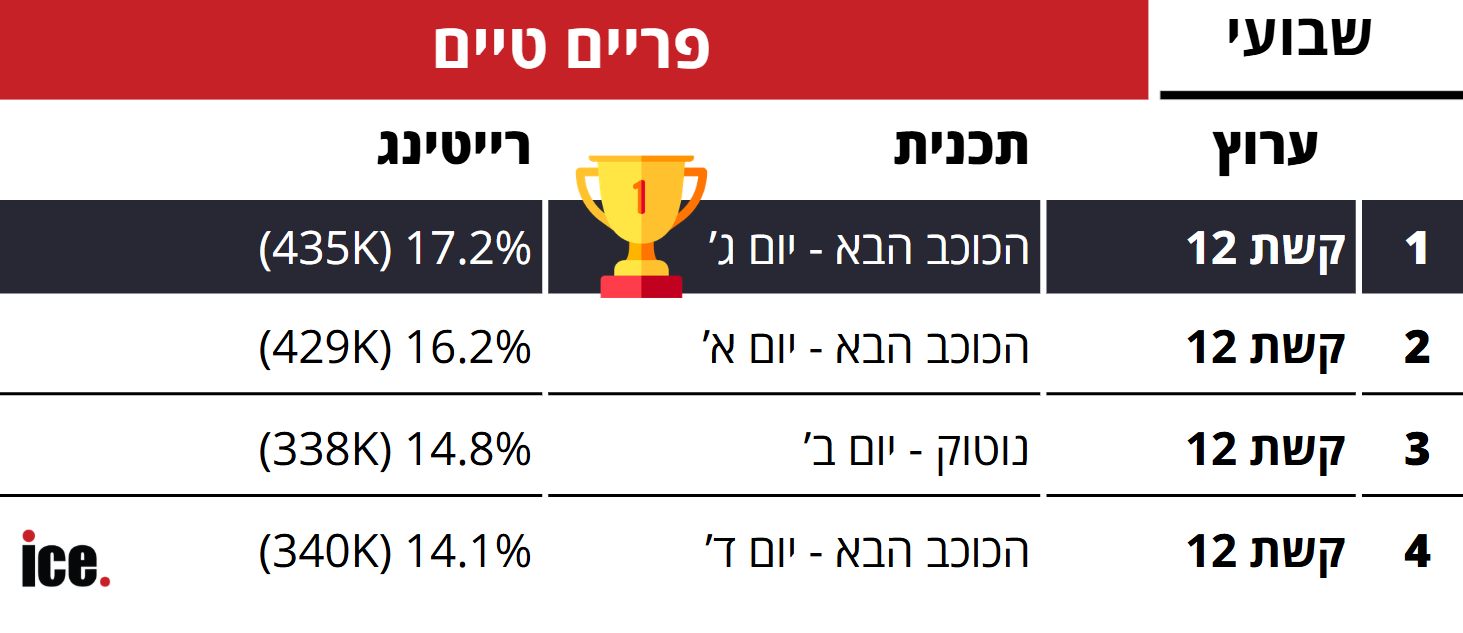 קשת 12 שוב שולטת בסיכום הרייטינג השבועי, כאשר "הכוכב הבא לאירוויזיון" בולטת עם נתונים גבוהים. הפרק ששודר ביום שלישי זכה ל-17.2% רייטינג (443 אלף צופים)