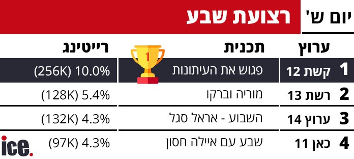 גם אמש, המשיכה קשת 12 לשלוט בפסגת נתוני הרייטינג, כאשר מהדורת חדשות סוף השבוע בהנחיית דנה וייס ניצחה גם הפעם עם מספר של 16% רייטינג ולא פחות מ-395,000 צופים. כמו בכל שבוע הקרב היה על המקום השני, שם הייתה יד של חדשות 14 עם ליטל שמש על העליונה וגברה על חדשות 13 עם 5.6% ו-170 אלף צופים לעומת מספר של 5.2% ו-131,000 צופים. כאן 11 נשארה הרחק מאחור.