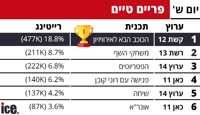 גם אמש, ניצחה קשת 12 בכל הגזרות, כאשר הכוכב הבא לאירוויזיון זכתה לנתון גבוה במיוחד של 18.8% רייטינג ו-477,000 צופים, רשת 13 גברה על ערוץ 14 בפריים טיים אולם הפסידה בגזרת החדשות