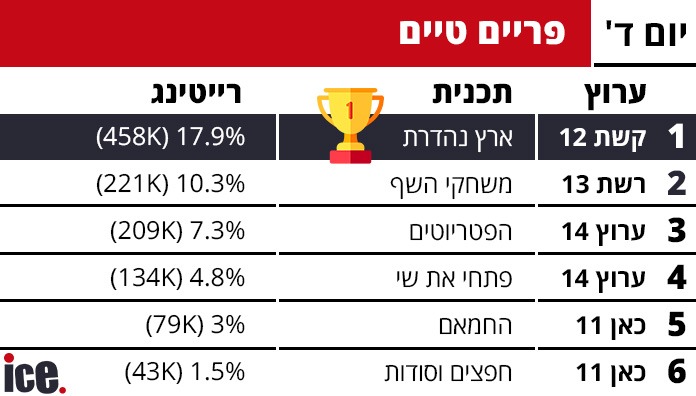 בגזרת הפריים טיים, "ארץ נהדרת" ממשיכה להוביל בגאון את הרשימה עם 17.9% רייטינג ו-458 אלף צופים, "הפטריוטים" דועכת במעט