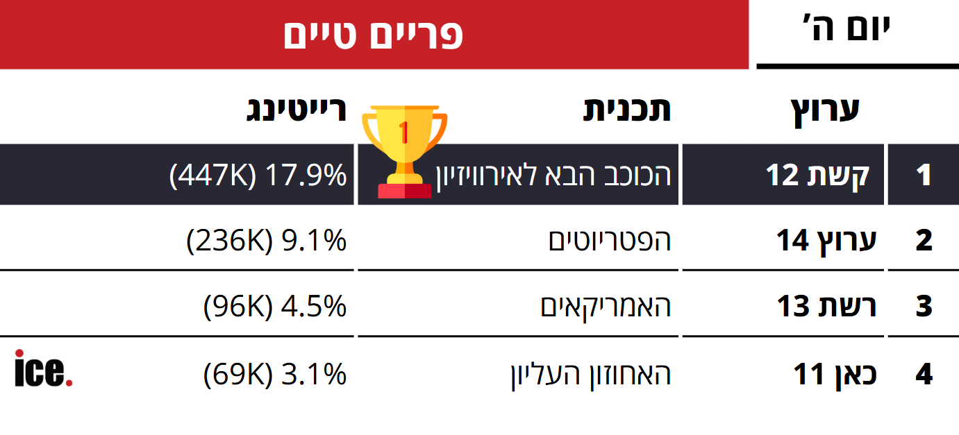 בגזרת הפריים טיים, הכוכב הבא לאירוויזיון מבית קשת מעל כולם עם 17.9% רייטינג (447 אלף צופים). הפטריוטים מבית ערוץ 14 במקום השני עם 9.1% רייטינג (236 אלף צופים), והאמריקאים של רשת 13 סוגרים את השלישייה הראשונה עם 4.5% רייטינג (96 אלף צופים).