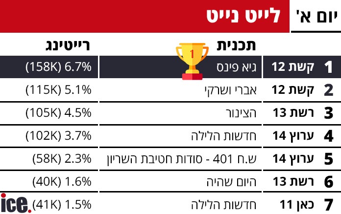 במסגרת תכניות הלייט נייט: במקום הראשון, גיא פינס וערוץ 12 עם 6.7% ו-158 אלף צופים. במקום השני שוב ערוץ 12 עם אברי ושרקי שרשמו 5.1% ו-115 אלף צופים. במקום השלישי הצינור של רשת 13 שרושמת 4.5% רייטינג ו-105 אלף צופים.