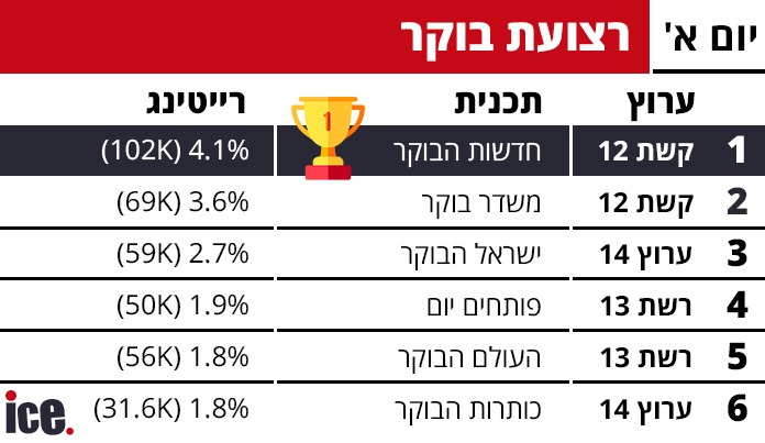 במסגרת תכניות הבוקר: חדשות הבוקר של ניב רסקין וקשת 12 נושמים אוויר פסגות של המקום הראשון, עם 4.1% רייטינג ו-102 אלף צופים. במקום השני ישראל הבוקר של ערוץ 14 עם 2.7% ו-59 אלף צופים. במקום השלישי העולם הבוקר של רשת 13 עם 1.8% ו-56 אלף צופים.