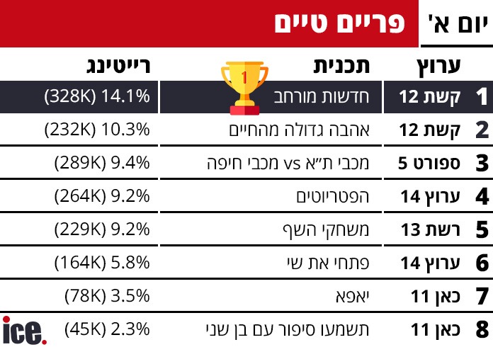 בגזרת הפריים טיים: במקום הראשון מהדורת החדשות המורחבת של קשת 12 עם 14.6% ו-354 אלף צופים. במקום השני אהבה גדולה מהחיים של קשת 12 שרושמת 10.3% ו-232 אלף צופים. במקום השלישי משחקי השף של רשת 13 עם 9.2% ו-229 אלף צופים. במקום הרביעי מכבי ת"א נגד מכבי חיפה בערוץ 5 9.4% ו-289 אלף צופים. במקום החמישי הפטריוטים של ערוץ 14 עם 9.1% ו-264 אלף צופים.