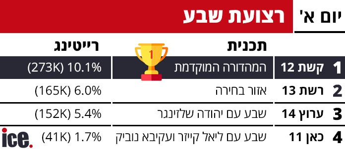 במסגרת הרצועות של שבע: במקום הראשון המהדורה המוקדמת של חדשות 12 עם 10.1 רייטינג ו-273 אלף צופים. במקום השני אזור בחירה של רשת 13 עם 6% ו-165 אלף צופים. במקום השלישי "שבע" של ערוץ 14 עם 5.4% ו-153 אלף צופים.