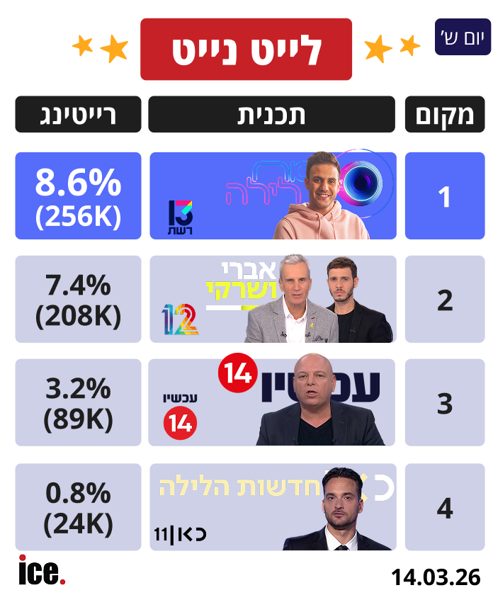 1.ומה לגבי נתוני הרייטינג של יום שישי? (ל"ת)אזרח הגון 03/2026/17הגב לתגובה זו0 0סגור