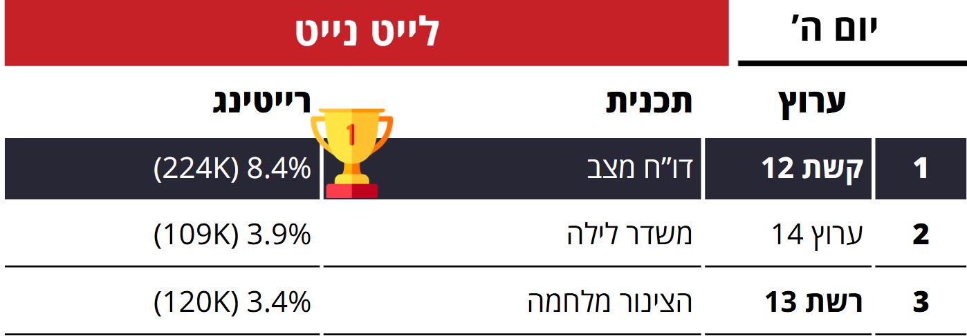 במסגרת תכניות הלייט נייט: במקום הראשון דו"ח מצב של ערוץ 12 עם 8.4% רייטינג שהם כ-224 אלף צופים. במקום השני משדר לילה של ערוץ 14 עם 3.9% רייטינג שהם כ-109 אלף צופים. במקום השלישי הצינור מלחמה של רשת 13 עם 3.4% רייטינג שהם כ-120 אלף צופים.