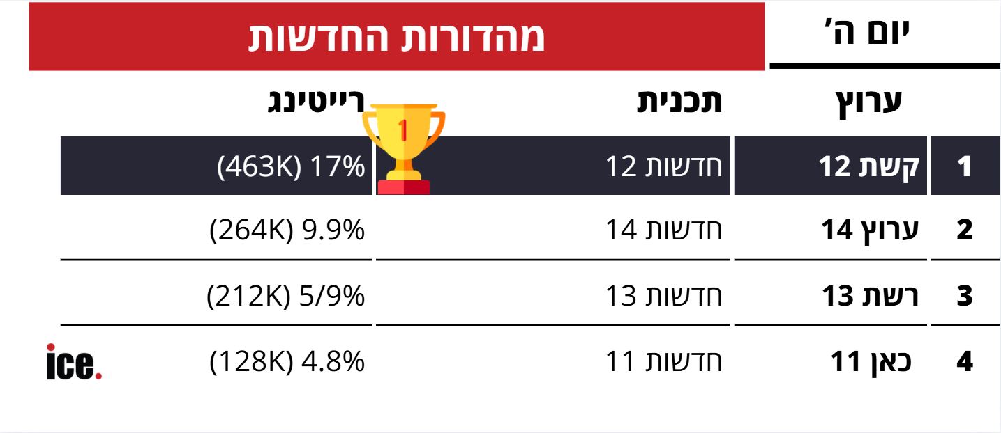 במסגרת המהדורות המרכזיות: במקום הראשון המהדורה המרכזית של חדשות 12 שרושמת 17% רייטינג שהם כ-463 אלף צופים. במקום השני חדשות 14 עם 9.9% רייטינג שהם כ-264 אלף צופים. במקום השלישי חדשות 13 5.9% רייטינג שהם כ-212 אלף צופים. במקום הרביעי חדשות כאן 11 עם 4.8% רייטינג שהם כ-128 אלף צופים.