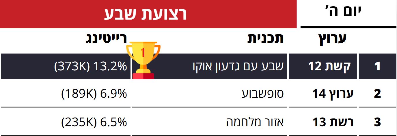 במסגרת הרצועות של שבע: במקום הראשון שבע של חדשות 12 עם 13.2% רייטינג שהם כ-373 אלף צופים. במקום השני סוף שבוע של ערוץ 14 עם 6.9% רייטינג שהם כ-189 אלף צופים. במקום השלישי אזור מלחמה של רשת 13 עם 6.5% רייטינג שהם כ-235 אלף צופים.