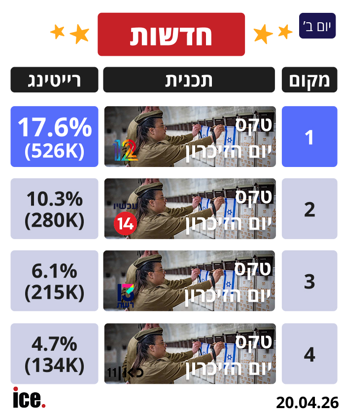 בגזרת החדשות: כל גופי השידור שידרו את טקס יום הזיכרון הממלכתי. חדשות 12 מובילה עם 17.6% (526 אלף צופים). במקום השני ניצבת המהדורה של ערוץ 14 עם 10.3% (280 אלף צופים), כשהיא עוקפת את חדשות 13 עם 6.1% רייטינג (215 אלף צופים) בעוד המהדורה של כאן 11 סגרה את הרשימה עם 4.7% (133 אלף צופים)