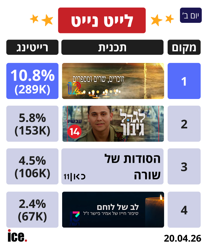 ברצועת הלייט נייט: במקום הראשון קשת 12, עם "זוכרים, שרים ומספרים" הגיעה ל-10.8% (289 אלף צופים). במקום השני התייצבה התוכנית "לגדול גיבור" של ערוץ 14 עם 5.8% (153 אלף צופים), כשהיא מקדימה את "הסודות של שורה" של כאן 11 שרשמה 4.5% (106 אלף צופים), שהצליחה לעקוף את רשת 13, שהגיעה למקום האחרון ברצועה זו עם "לב של לוחם" שרשמה נתון של 2.4% (67 אלף צופים).