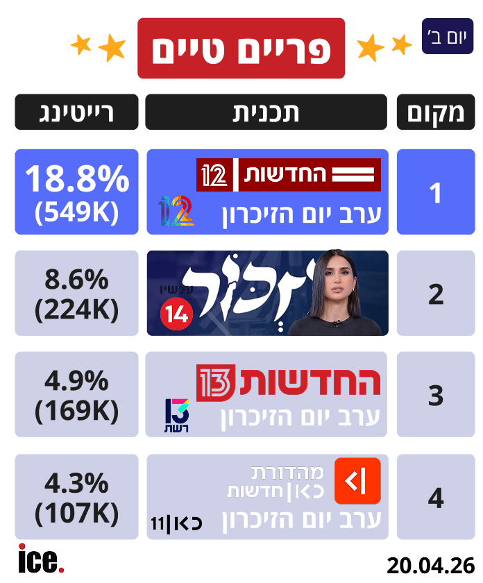 בגזרת הפריים, כל גופי השידור שידרו את מהדורות ערב יום הזיכרון. חדשות 12 מובילה עם נתון של 18.8% (549 אלף צופים). במקום השני ערוץ 14 עם "מהדורת זיכרון מיוחדת של מגי טביבי" שרשמה נתון של 8.6% (224 אלף צופים), לא מדובר בפעם הראשונה שמגי טביבי מנחה את טקס יום הזיכרון, ויש לה היסטוריה מרשימה בתור מנחה באירועים טקסיים. חדשות 13 הסתפקה ב-4.9% (169 אלף צופים), בעוד המהדורה של כאן 11 סגרה את הרשימה מאחוריה עם 4.3% (107 אלף צופים).