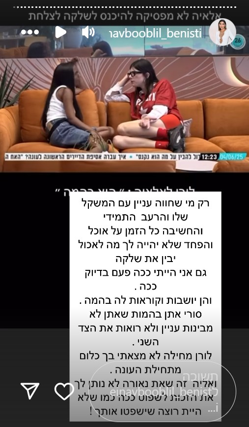 גולשים רבים, שסלדו מהיחס כלפי הדיירת הגיבו ברשת בזעם והזהירו מפני עידוד הפרעות אכילה: "רק מי שחווה עניין עם המשקל שלו והרעב התמידי והחשיבה שלא יהיה לך מה לאכל יבין את שלקה", כתבה בסטורי עינב בובליל. "גם אני הייתי ככה פעם, בדיוק ככה. והן קוראות לה בהמה. סורי, אתן בהמות שאתן לא מבינות עניין ולא רואות את הצד השני".