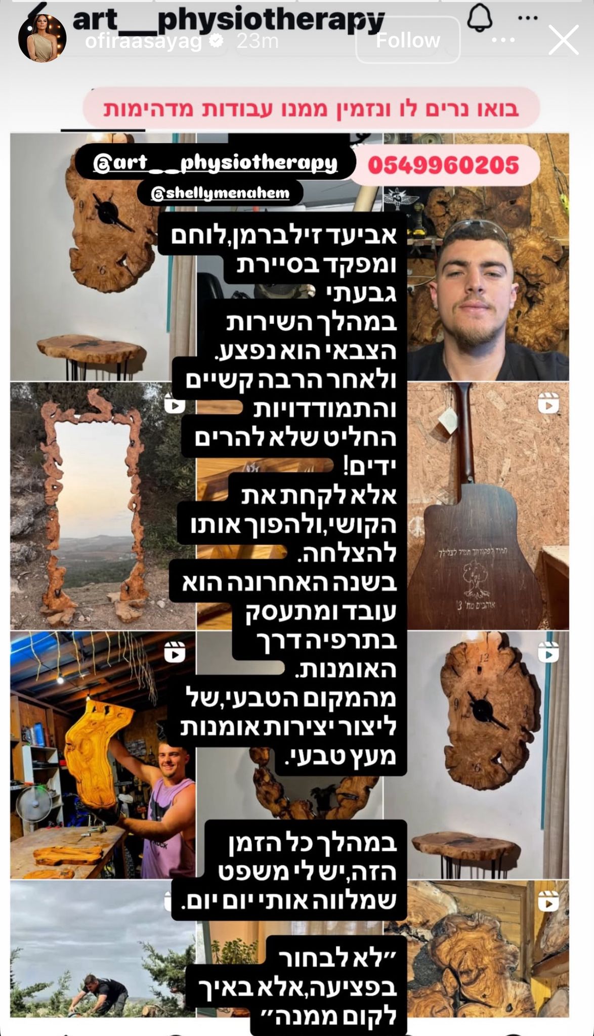 היא המשיכה: ''לאחר הרבה קשיים והתמודדויות הוא החליט שלא להרים ידיים אלא לקחת את הקושי ולהפוך אותו להצלחה. בשנה האחרונה הוא עובד ומתעסק בתרפיה דרך האמנות''.