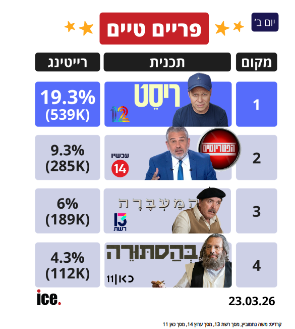 נתוני הרייטינג של הפרק האחרון של ריסט שבוע שעבר.