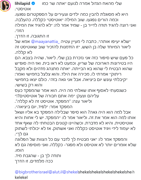 ליהיא לפיד נגד דיירת האח הגדול: "ילדים וצעירים על הספקטרום נפגעו"