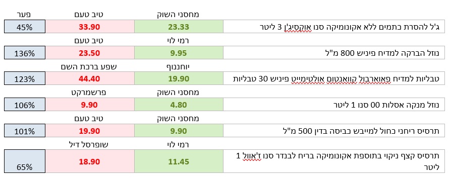 עוד עולה מהסקר פער מחירים קיצוני על אותם מוצרים בדיוק: נוזל הברקה למדיח פיניש (800 מ"ל) נמכר ב-9.95 שקל ברמי לוי לעומת 23.50 שקל בטיב טעם - פער של 136.18%.