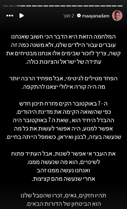 לדבריה הטילים אינם מפחידים, כמו מצב שבו לאיראן היו יכולות גרעיניות אמיתיות: "המלחמה הזאת היא הדבר הכי חשוב שאנחנו עוברים עבור הילדים שלנו, ולא משנה כמה זה קשה, צריך לזכור שבימים אלו אנחנו מבטיחים את עתידה של ישראל והציונות כולה. הפחד מטילים לגטימי, אבל מפחיד הרבה יותר מה היה קורה אילולי יצאנו להתקפה. ה-7 באוקטובר הקים מזרח תיכון חדש, כפי שהשואה הקימה את מדינת היהודים".
