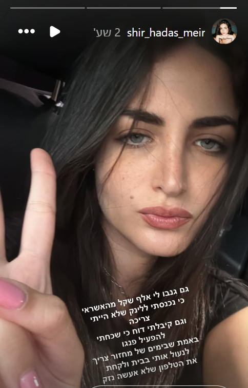בסטורי שהעלתה שיר הדס מאיר, היא שיתפה: "חשבתי שבאמת יש לי חוב בכביש 6 כי החלפתי אוטו, אבל לא היה לי חוב. במקום זה תידלקו עם האשראי שלי ב-1000 שקלים בתחנת דלק סונול בקלנסווה".