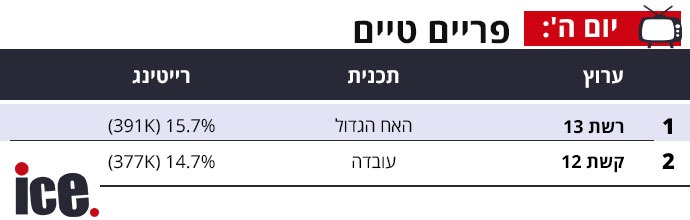 ערוץ רשת 13 השיג ניצחונות מרשימים ברייטינג אתמול (חמישי) שבפריים טיים "האח הגדול" ברשת 13, הובילה את הרייטינג עם 15.7% וכ-391 אלף צופים לעומת עובדה בקשת 12 שהשיגה 14.7% עם 377 אלף צופים. למרות הביקורות סביב הדחתו של המתמודד יהודה יצחקוב מהאח הגדול ומחאת הצופים שאמרו כי יחרימו את התכנית.